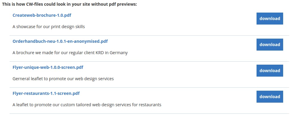 CW-files is a Joomla® module to Provide downloads. It's specialty are PDF documents, but it works perfectly for all kinds of downloads.